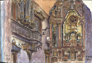 With my task accomplished, I took my ritual tour of the woods, but with the rain coming to stay, couldn't sketch but from a sheltered place. The church interior was an idea, but since Sunday Mass was taking place, there wasn't any option except seating quietly under a long collonate in one of the adjoining support buildings for pilgrims, across which there were several tables, and staying there, enjoying the ancestral atmosphere only these places can offer, while putting into paper whatever was in front of me.