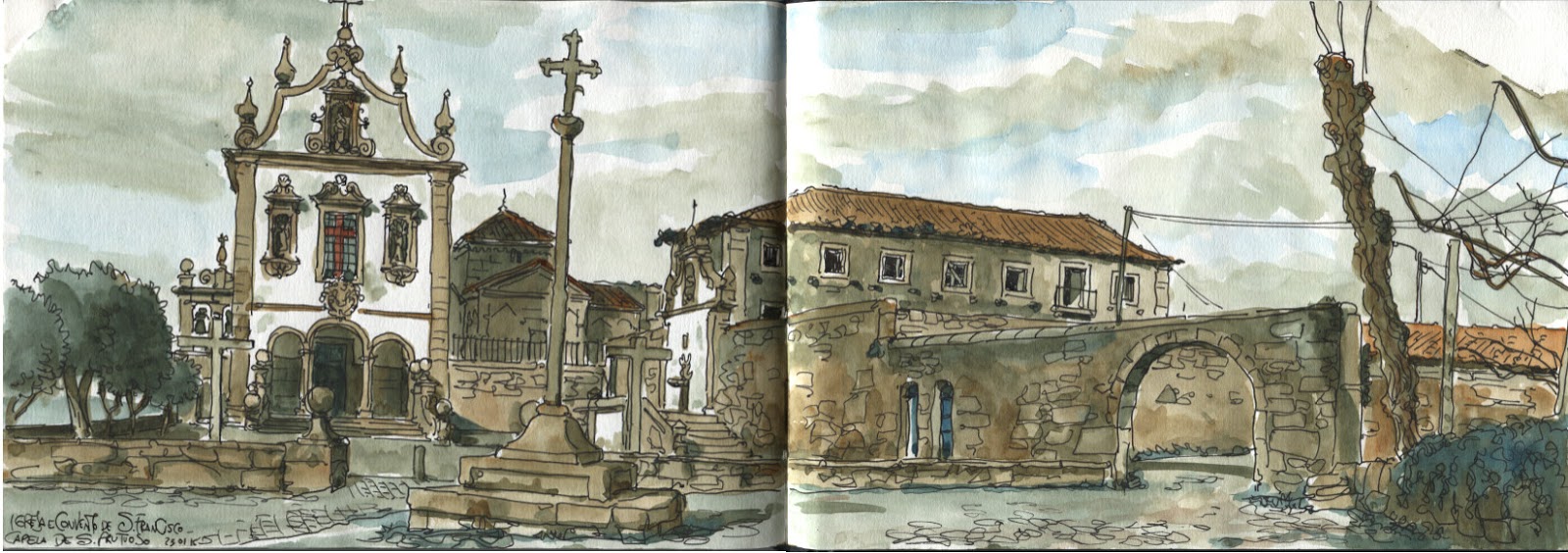 Mesmo com o convento em ruínas, todo este conjunto inserido num núcleo rural que faz esquecer o quão freneticamente as áreas em redor se têm vindo a suburbanizar, é muito agradável à vista e não tem preço o bocado agradável que aqui passei a desenhá-lo.